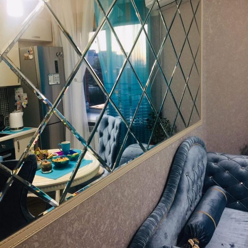 Для украшения использовалась зеркальная плитка формы вытянутый ромб серебряного цвета.