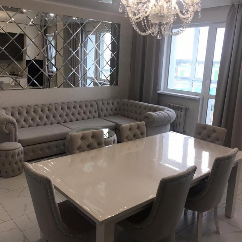 Сегодня перед нами поистине королевский интерьер столовой. Буквально все здесь блестит и переливается: и стеклянный столик, и глянцевая столешница, и роскошная люстра. Не последнюю роль в этом блеске играет зеркальное панно.