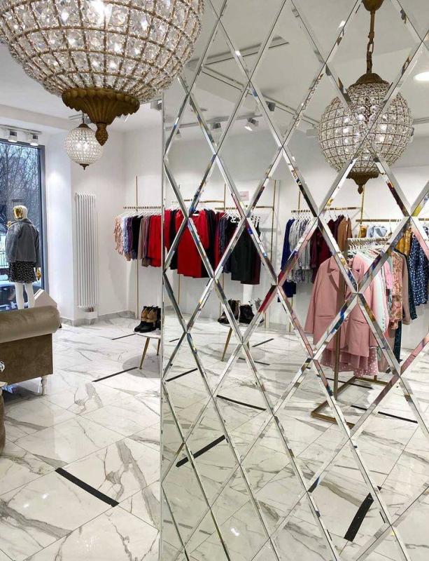 • Зеркальное панно в салоне, Москва, серебристая зеркальная плитка "восьмиугольник" и золотистая зеркальная плитка квадратной формы